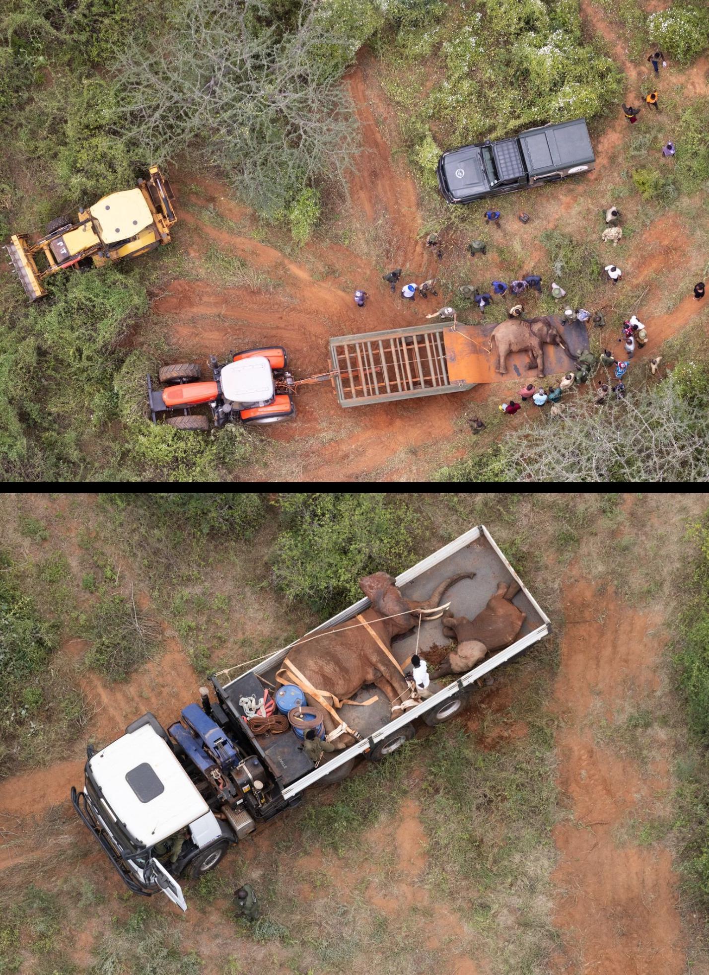 Closer to Kaluku, a group of three elephants that have been scheduled for translocation for several weeks were nally moved They had refused all previous attempts to be persuaded through the fence on foot The operation involved a KWS/SWT Mobile Vet team as well as a backhoe, crane truck, and a tractor with a specialised trailer. Aerial support included xed-wing aircraft to assist in locating the elephants and a helicopter to dart the three individuals and help guide them to the ground team Once darted, all three were loaded onto the crane truck and trailer and moved a short distance into the park. Earlier, in the same area, a group of seven bull elephant were successfully pushed through a dropped section of the fence with the helicopter.
