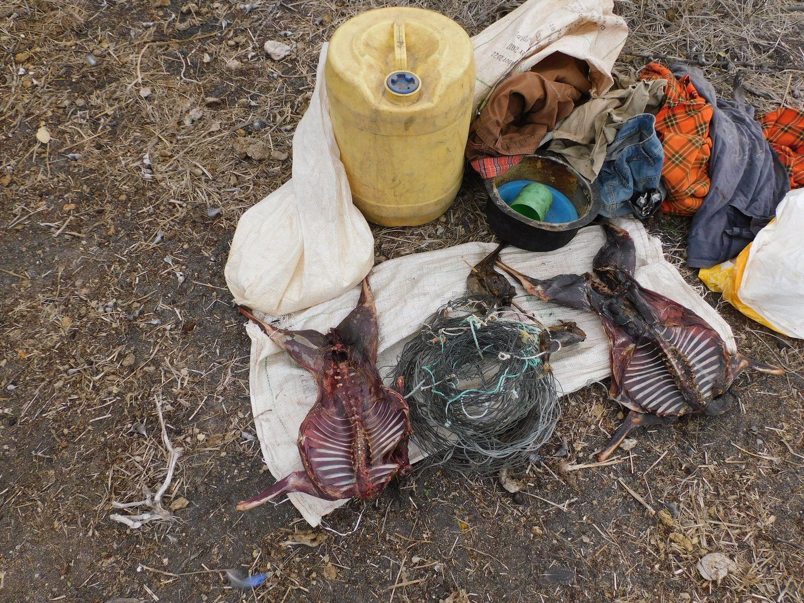 The Kenze team found a bushmeat poaching camp, which had recently been active with a fresh carcass