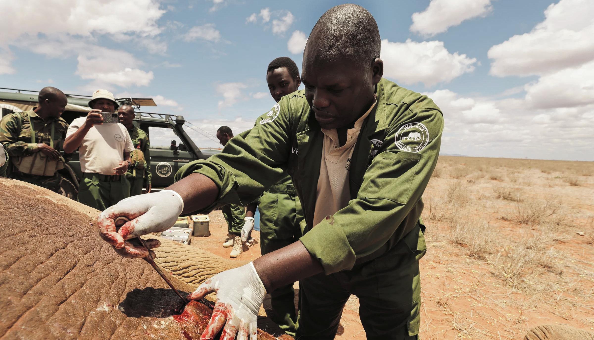 The nal case was of a known 'problem bull' who consistently breaks out of the park and is found in settled areas along the boundary The local community reported sightings of a limping bull near a school He was later located by a helicopter. After con rming the injury, the SWT/KWS Tsavo Mobile Vet Unit was collected and own to Kaluku, where he proceeded by helicopter to dart and treat the bull. After treatment, the SWT helicopter helped push him back into the protection of the park