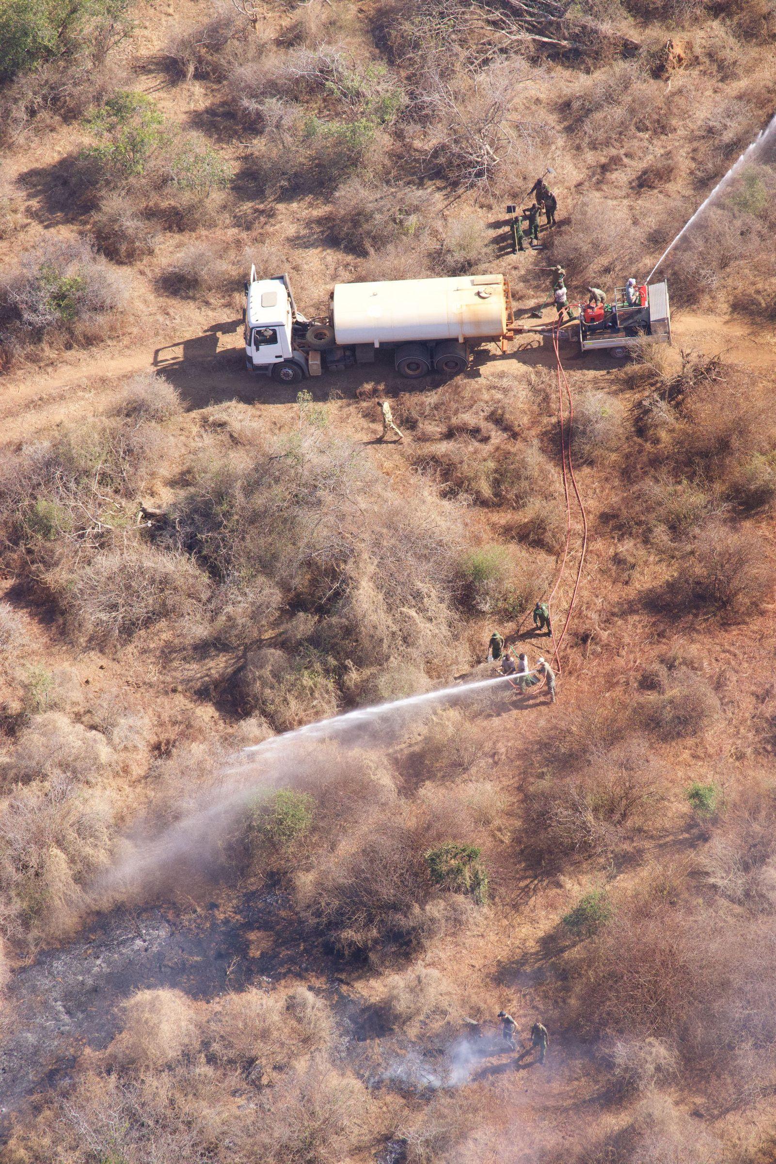 Fire season continued in September, with over a dozen res recorded throughout the month The Aerial Unit supported re ghting efforts from the sky on three occasions. The largest re in September burned for a total of four days and affected a total of 15,000 acres in Chyulu Hills National Park, with an estimated 13,500 acres between patches of mature forest, which resisted the re A further 5,000+ acres were burnt elsewhere in Tsavo East, Tsavo West, and KARI Ranch