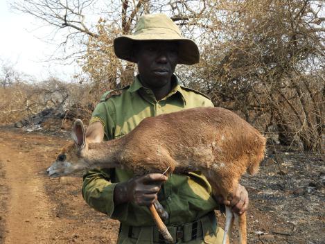 The Kenze team lifted wire snares set by bushmeat poachers in the park and rescued a duiker from a snare