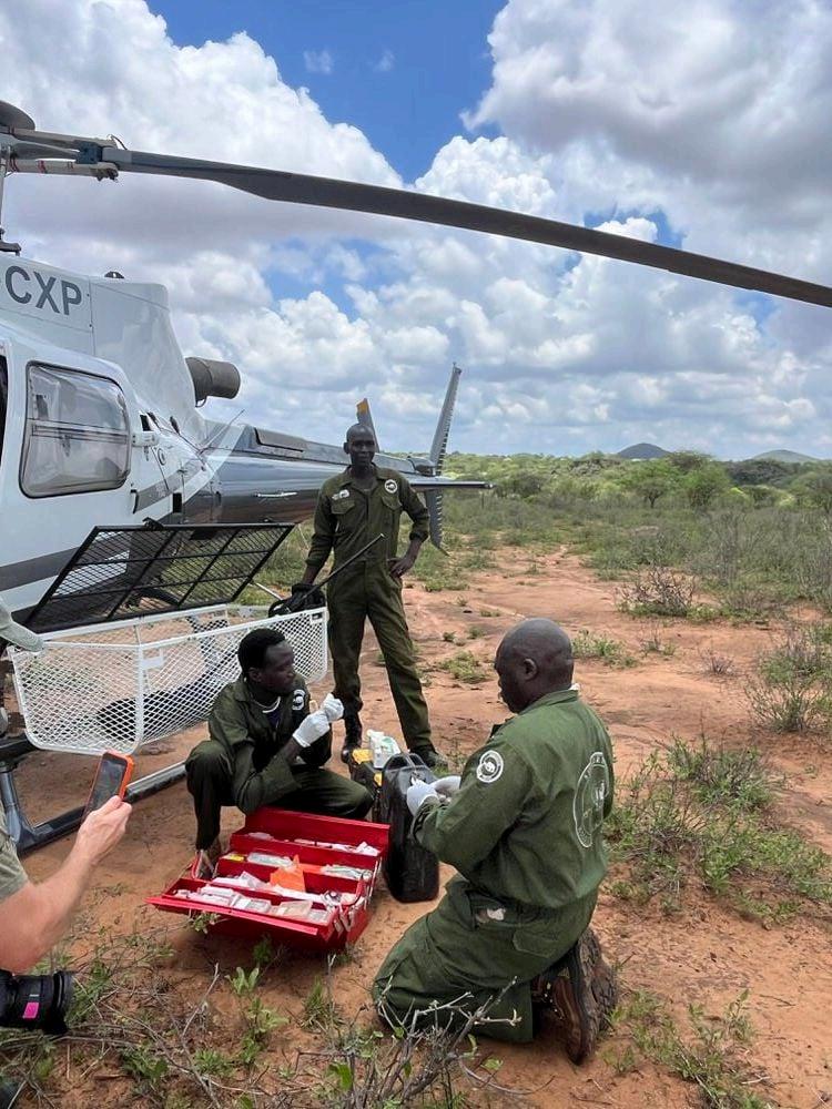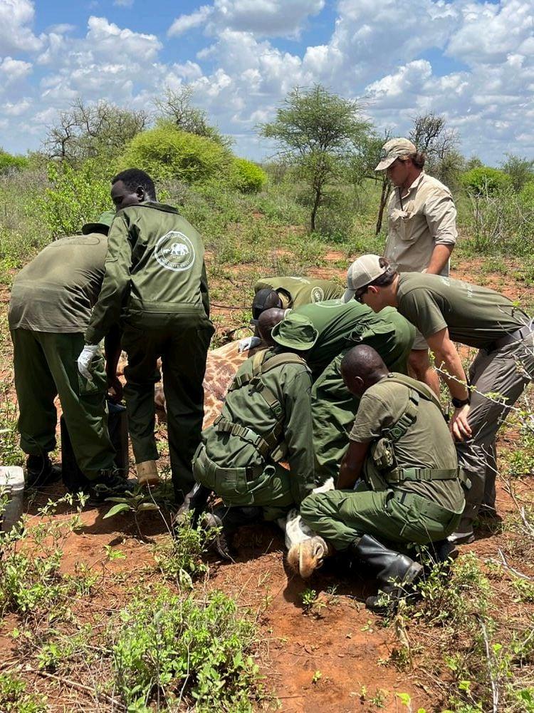 The most persistent and troubling activity during the month came from the Nasaru Conservancy area, where a concentrated outbreak of snaring required aerial intervention on two occasions within a single week. Our fixed-wing aircraft first identified an injured giraffe during a routine patrol on 1st March a snare cutting into the animal's hind left leg. The helicopter and veterinary team mobilised, the snare was successfully removed, and the prognosis for recovery was good.
