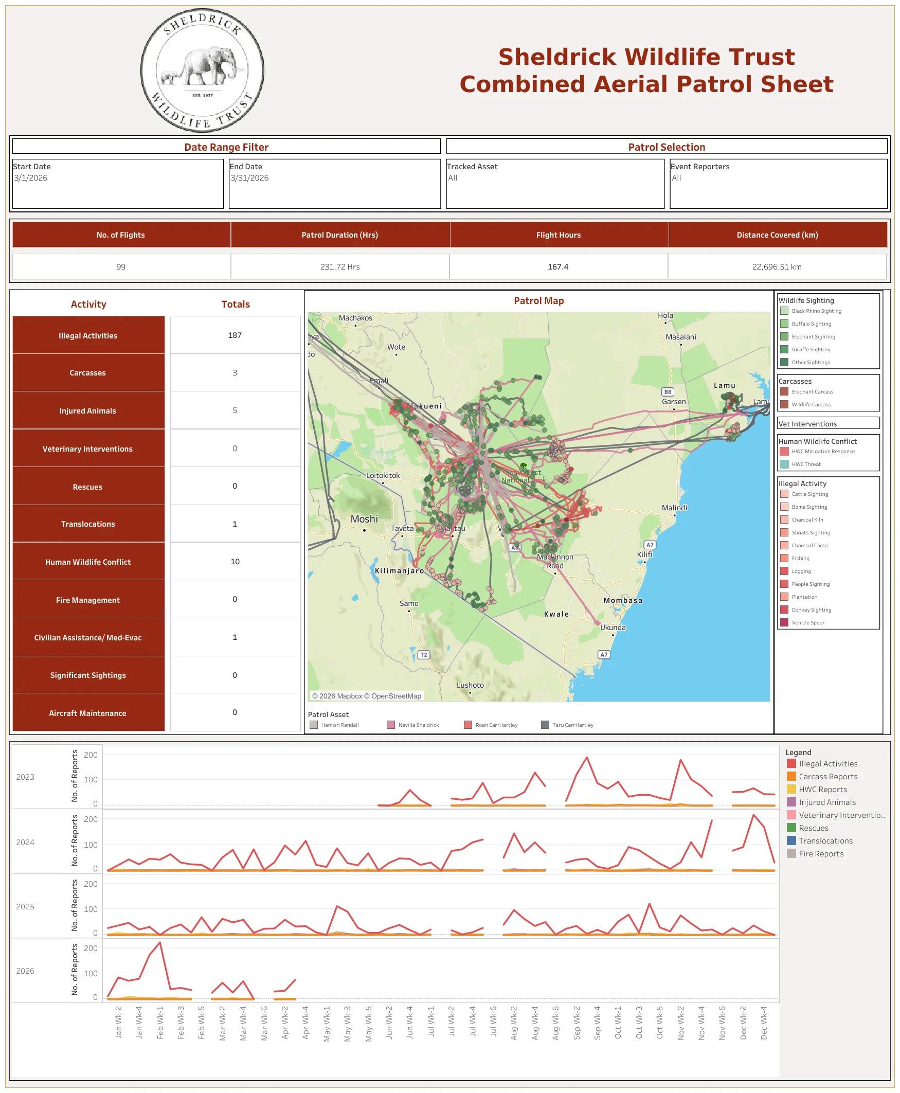 In March, the Aerial Unit flew 167 hours and covered 22,696 kilometres. The month was defined by unusually generous rainfall across the Tsavo ecosystem a welcome but unexpected gift, as the March-April long rains can be disappointing