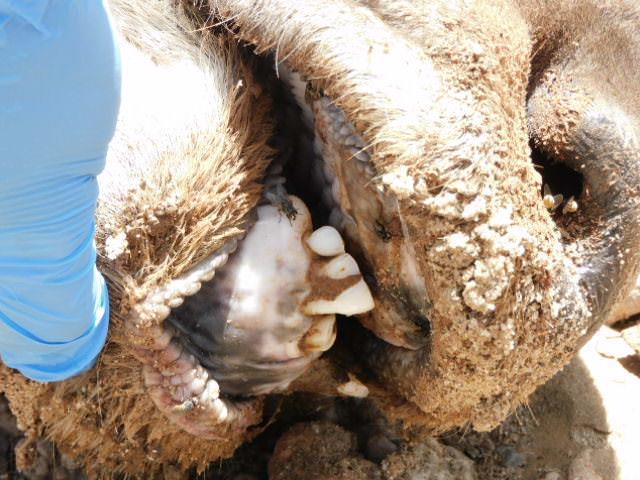 The male eland carcass was found lying in left lateral recumbency. It had deep-sited sternal wound. The wound was old and approximately not less than 3 months. Based on the location of the wound, it most likely resulted from a possible territorial fight with other males. The dental formula was incomplete, and the teeth that were present were eroded which indicated advanced age.