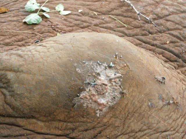 The elephant bull had wounds below the scrotum. The injuries were most likely inflicted by another elephant bull during a fight. The wounds oozed pus and the adjacent prepuce was swollen. The pus-filled wounds were drained and irrigated with Hydrogen peroxide and Iodine solution. An Amoxicillin injection was administered and Oxytetracycline spray was topically applied on the wound to cover for bacterial infection.