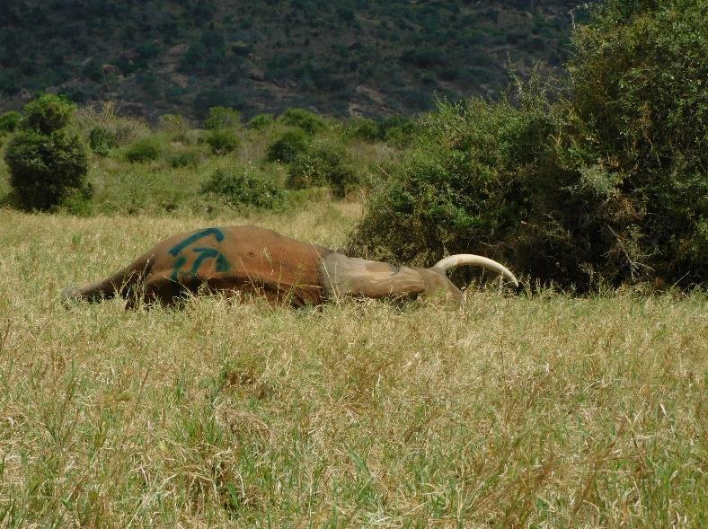 The May Veterinary cases attended to involved four species in four interventions. These included the treatment of a giraffe and a zebra for a snare and arrow wound respectively, the collaring of a lion known to prey on livestock, and a postmortem examination of a hyena which was killed after attacking 3 people Rabies disease was associated with the hyena killed in Ilkilunyet, Chyulu Hills. In June the Unit attended to 2 elephants, one for natural causes and the other for an arrow wound.