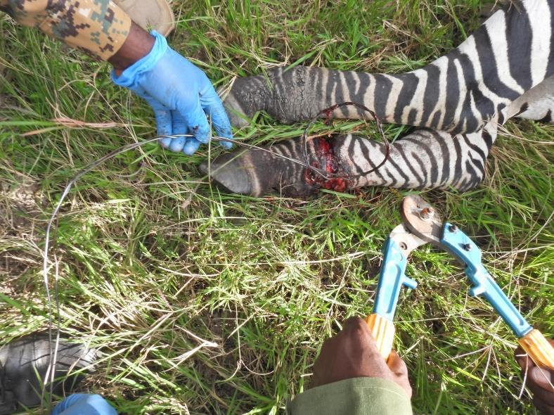 The tight snare had cut through the soft tissues and had reached the bone. The snared was lightly pulled and cut. The dead tissue was removed followed by cleaning and disinfection with Hydrogen peroxide, then water and finally Iodine. It was then sprayed topically with Oxytetracycline. Systemic administration of antibiotics was done using 15000mgs of Amoxicillin and 30mgs Dexamethasone anti-inflammatory intramuscularly.