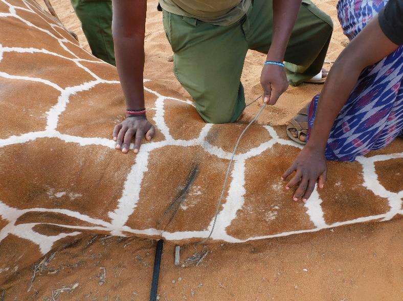 The giraffe was darted on the left rump with 8 mgs Etorphine and 20 mgs Azaperone. Complete immobilization was achieved after 5 minutes. The giraffe went down on left lateral recumbency, it was manually restrained and blindfolded then anaesthesia was immediately reversed with 100 mgs Naltrexone administered through the jugular vein. A fresh clean-cut wound was observed on the right hind leg proximal to the ankle joint, it was suspected that the wound was inflicted by a sharp object. An examination of the fibula bone showed it was intact. The wound was cleaned with water, flushed with Hydrogen peroxide and Iodine, and packed with green clay. An antibiotic spray was also applied on the treated wound to keep off flies and manage bacterial infections. 60 mg Dexamethasone sodium and 6,000 mg Amoxicillin were administered then the giraffe was released.