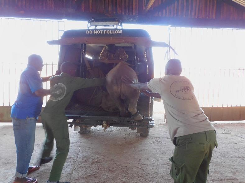 The calf was approached on foot and darted on the right rump with 1 mg Etorphine and 10 mgs Azaperone. He was startled and ran for about 50 metres before the drugs took effect. He was then secured, blindfolded, physically restrained, and doused with water to aid in cooling his body. He was then taken to a holding room 15 mgs Butorphanol were administered intravenously to manage respiratory depression before reversing the anaesthesia with 20 mgs Naltrexone (10 mgs intravenously & 10 mgs intramuscularly). The rhino calf was later given 40 mg Azaperone intramuscularly and loaded into a well-ventilated lorry with a sand cushion on the floor and transported to the KWS Headquarters in Nairobi for nurturing.