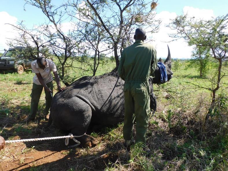 Meru National Park Rangers reported a white rhino with an injury to the hind limb near the hock joint. The Nanyuki Vet unit attended the case as the Meru Vet unit were on off duty. The rhino was being monitored by rangers and was easily found. A helicopter was called in from Nairobi KWS airwing to assist in immobilization.