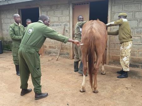 An adult female security horse in Aberdare National Park was reported to be dull and inactive, it was lying down most of the time and was anorexic.