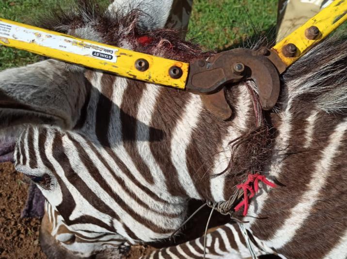 Heri was approached on foot and darted on the right rump with 5 mgs Etorphine and 40 mgs Azaperone. She went down on left lateral recumbency 5 minutes post-darting, then she shifted to sternal recumbency. She was physically restrained, and Oxygen supplementation administered to enhance respiration Heri was in good body condition, she had overgrown hooves and a broken left front hoof. 4,000 mgs Phenylbutazone and 3,000 mgs Amoxicillin were administered then the broken hoof was debrided with Hydrogen peroxide, flushed with Iodine and sprayed with Oxytetracycline. The overgrown hooves were also trimmed Anaesthesia was reversed thereafter with 100 mgs Naltrexone administered via the jugular vein. She rose 2 minutes post-reversal.