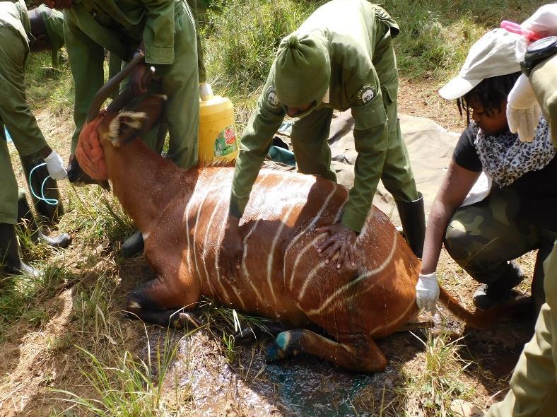 The mountain bongo was darted from foot with 4mg Etorphine hydrochloride in combination with 30mg Azaperone. The dart was delivered on the musculature of the left hindlimb, but it did not discharge fully. A blindfold was applied to prevent stimulation by light and oxygen insufflation started intranasally to improve cardio-respiratory function. The bongo remained standing therefore it had to be restrained physically and walked to the loading site. A blood sample was collected, and thin blood smears were made. Systemic cover was done using; 3,000mg Amoxicillin (I.M) and 40mg Dexamethasone (I.M), 20ml Multivitamin (I.M) and 50mg Ivermectin (S.C).
