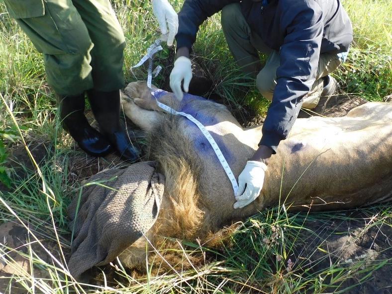 Anaesthesia was topped up for the 1st with 100mg Ketamine administered 38 minutes post darting, another 200mg was administered intramuscularly 6 minutes later. Topical Oxytetracycline spray was applied on the fight wounds on the 1st lion. The 2nd lion received 150mg Ketamine and 4mg Medetomidine 57 minutes postdarting and an additional 200mg Ketamine administered intramuscularly 15 minutes later. For both lions, Cloxacillin (Opticlox®) was infused into the dart wound and topical Oxytetracycline spray applied. A collar was fitted on the neck of each lion. The lions were then loaded onto a stretcher and transferred to a metal cage in the translocation lorry. Anaesthesia was reversed with 4mg Atipamezole for each lion. Both lions were translocated to Soysambu Conservancy and successfully released.