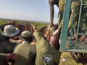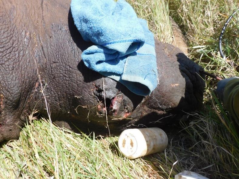 Lucky was darted from a helicopter with 4mg Etorphine and 60mg Azaperone on the musculature of the left rump. He went into sternal recumbency when the drugs took effect after 6 minutes. Lucky was blindfolded and 5mg Butorphanol administered intravenously. Oxygen insufflation was started intranasally to improve cardio-respiratory function and Butorphanol was further administered at an interval of 5mg then 10mg intravenously. 20mg Doxapram was administered intravenously to improve respiratory function.