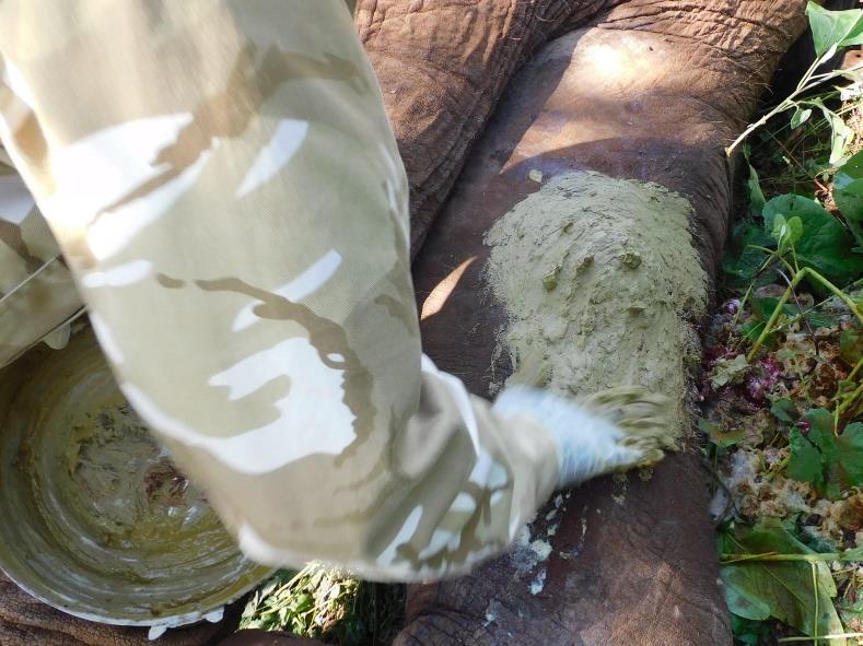 The elephant was approached on foot and darted with 18mg Etorphine hydrochloride on the right rump. It assumed left lateral recumbency 7 minutes later. The animal was found to be in fair body condition (score of 3 out of 5). It had a small penetrating wound on the left forelimb distal to the elbow joint that was infected and oozing pus. No foreign objects were found in the wound. The wound was flushed with dilute Hydrogen peroxide and rinsed with Iodine. Oxytetracycline pessaries and green clay were packed into the wounds then topical Oxytetracycline spray applied. The animal was turned onto its right side for examination of the lateral side of the limb. There was a slightly infected laceration distal to the elbow joint, which was scrubbed with Hydrogen peroxide, rinsed with Iodine, packed with Oxytetracycline pessaries and green clay then sprayed topically with Oxytetracycline 20,000mg Oxytetracycline, 16,000mg Phenylbutazone, and 40 ml Catosal were administered intramuscularly before anaesthesia was reversed with 375mg Naltrexone given intravenously. The elephant stood 2 minutes later.