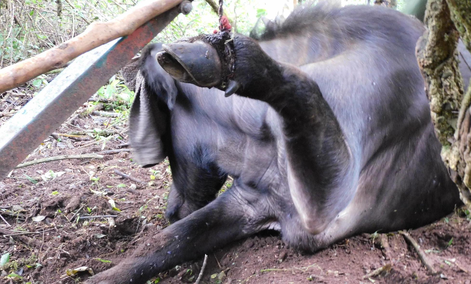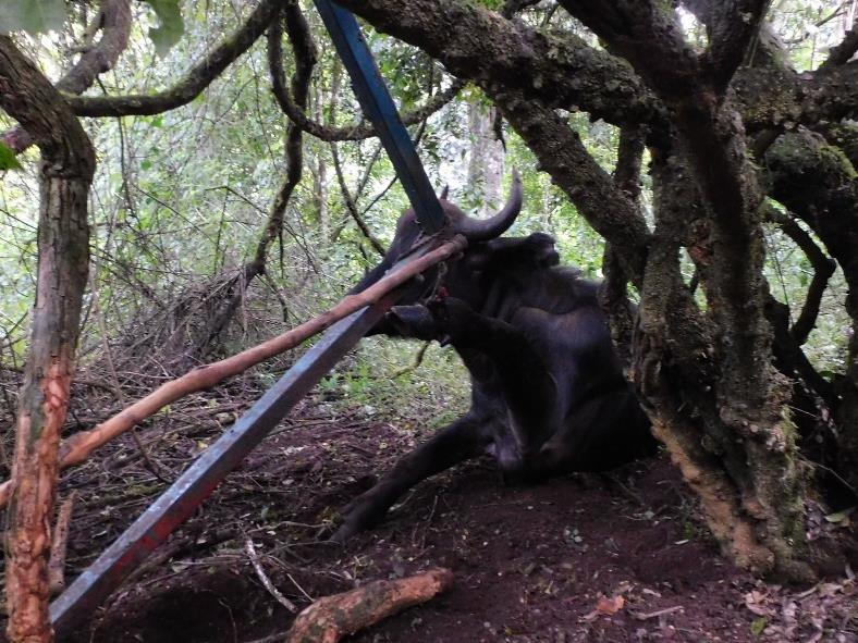 A snared adult female buffalo was reported to be in sternal recumbency in the forest at Sagana State Lodge. The buffalo had become trapped after the metal gate attached to the snare on the left forelimb was caught in a thicket.