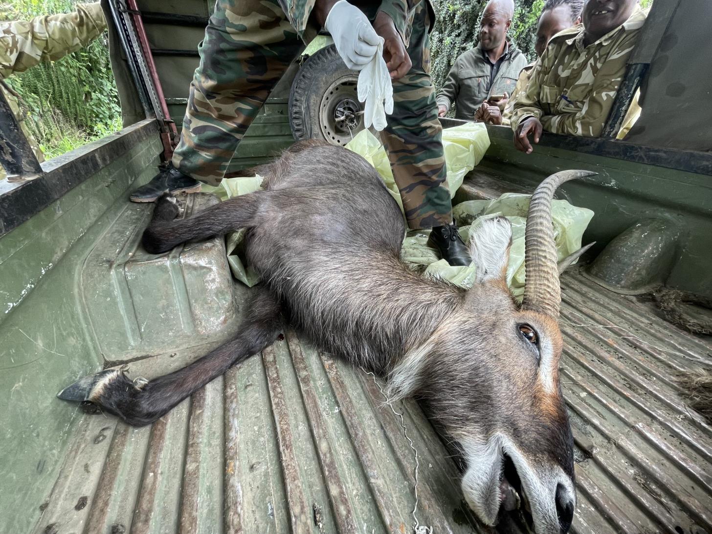 The water buck had been involved in a territorial fight with another male at Rumi Flowers. Unfortunately, the animal suffered a spinal cord injury that resulted in paralysis of the front and hind limbs. Puncture wounds were observed on the hind legs. The waterbuck had a poor prognosis. Therefore, it was put to rest to alleviate further pain and suffering.