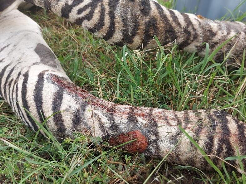 Lame adult male zebra with its tendon on the left hind leg severed by a sharp object Poaching Death