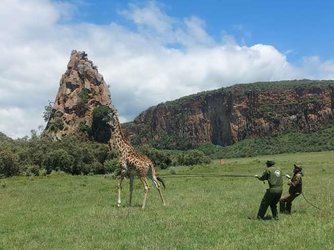 Hell’s Gate National Park management reported the sighting of an adult female Masai giraffe with a long wire snare on the hind leg.