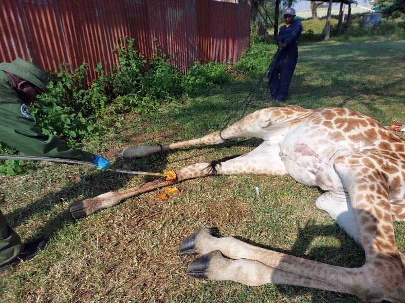 On examination the female giraffe had a long-standing wire snare on the hind leg. The snare had caused a large gangrenous wound. The wire had cut off the extensor tendon of the leg