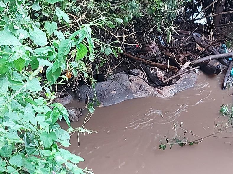 Both carcasses were found on the floor of the Makalia River. The area is swampy and not accessible. The riverbanks are steep and slippery. The adult female carcass was lying in a supine position. The carcass had been trapped by roots of trees and branches at the floor of the river. The lower and upper horns were present and retrieved for custody. A farm tractor could not access the river to assist in retrieval of the adult carcass and the carcass remains on the floor of the river.