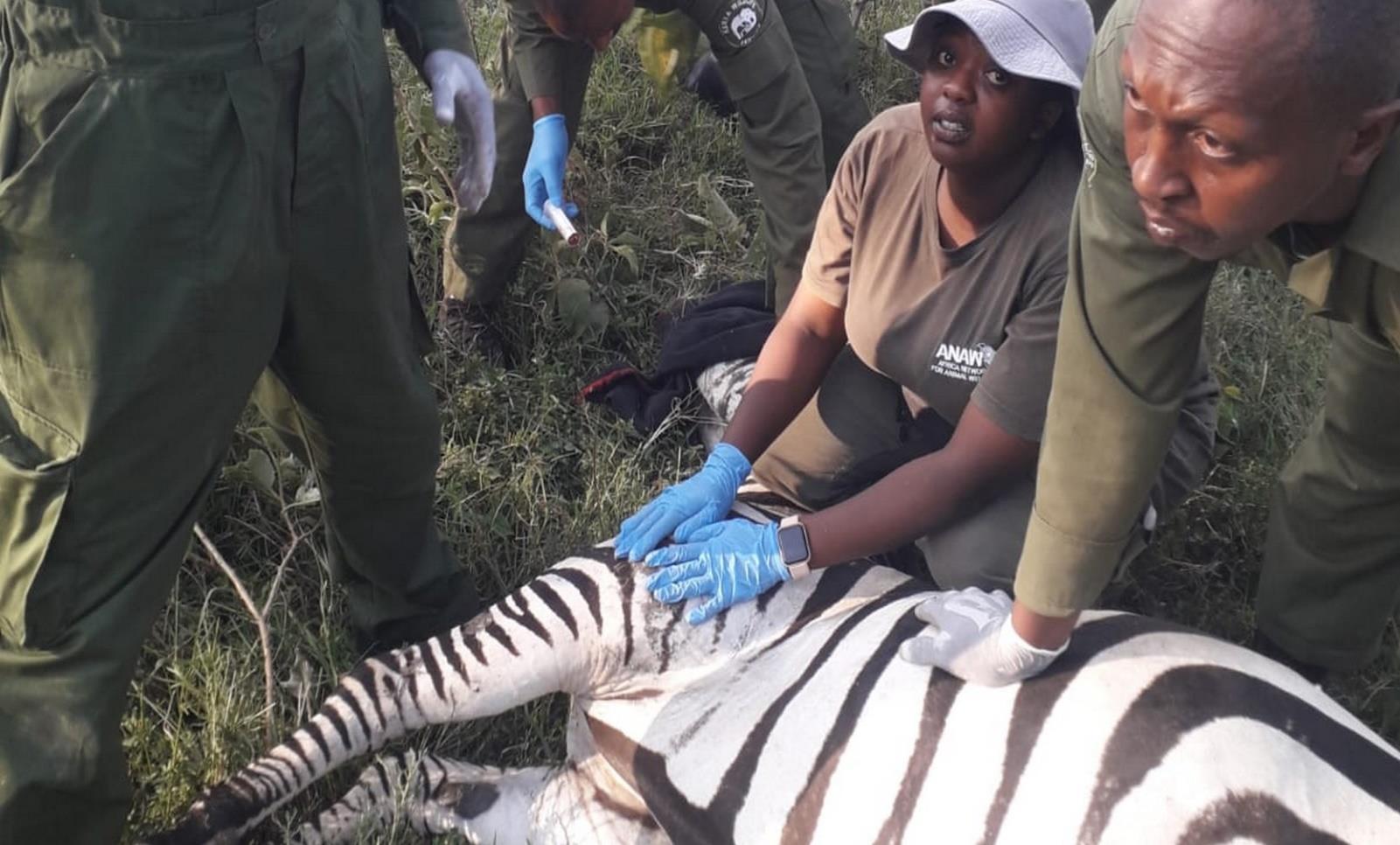The zebra had been wounded and snared by a winch wire on the right front leg