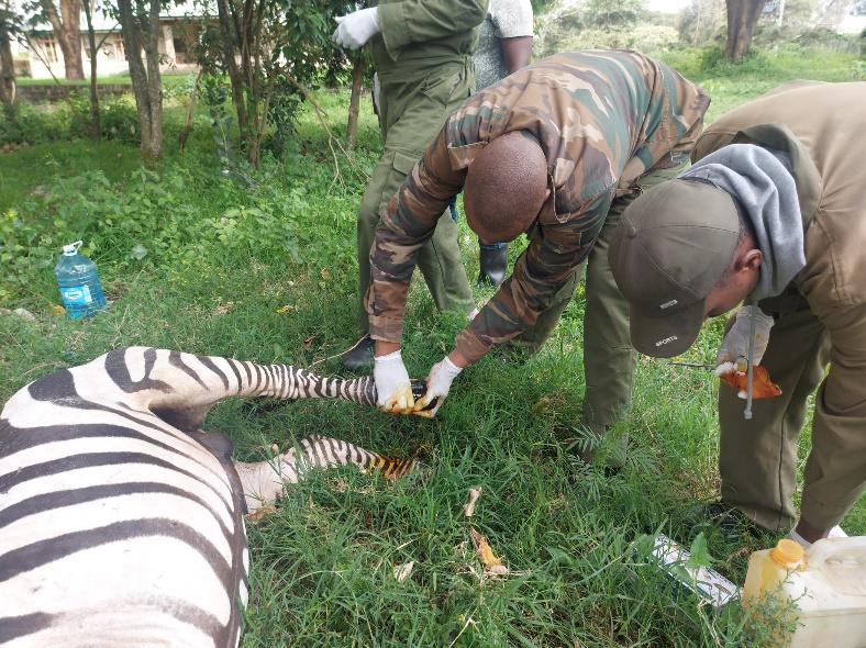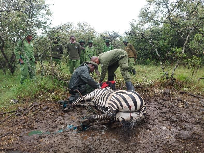 The team also attended to 2 human – wildlife cases. The 1st involved a common zebra foal with injuries on its hind legs sustained when it was trapped in a wire fence. Thankfully, the foal was successfully treated. The 2nd case involved the translocation of 14 ‘problematic’ common zebras from Naivasha Prisons and Naivasha Police to Solai/Tindress Wildlife Sanctuary. During the same capture/ translocation exercise, the team also captured and translocated 5 common elands from Soysambu Conservancy to Solai/Tindress Wildlife Sanctuary. All the animals were safely translocated and released in the Sanctuary save for 1 male adult eland that was found dead upon arrival at the release site. The team also attended to a lame common zebra in Sanctuary Farm and dewormed a security horse in Mt. Elgon National Park.