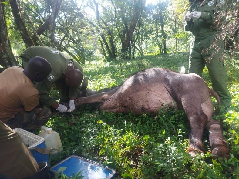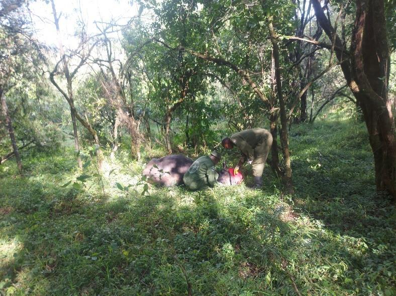 The animal was darted with 9mg Etorphine and 70mg Azaperone. It had been wounded by the nylon rope snare on the right front leg