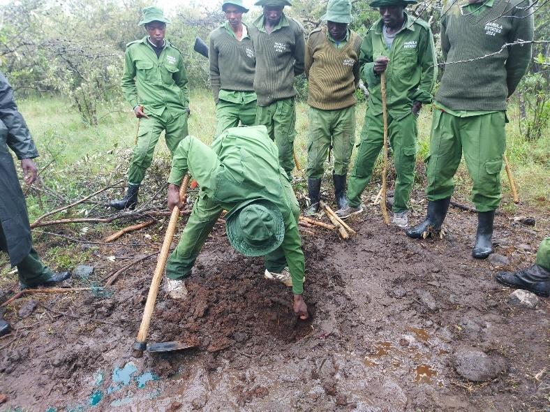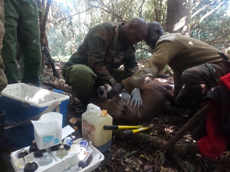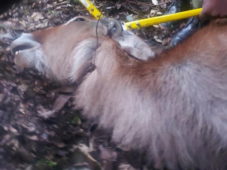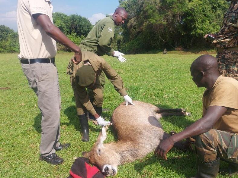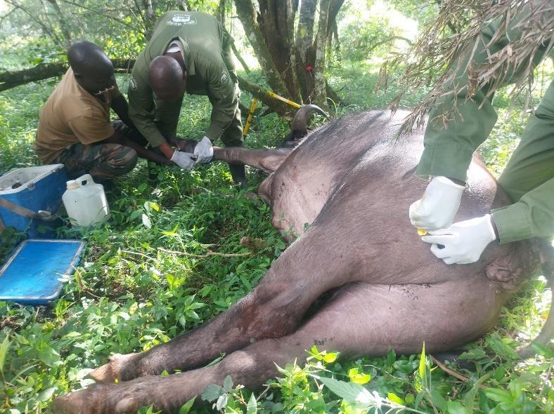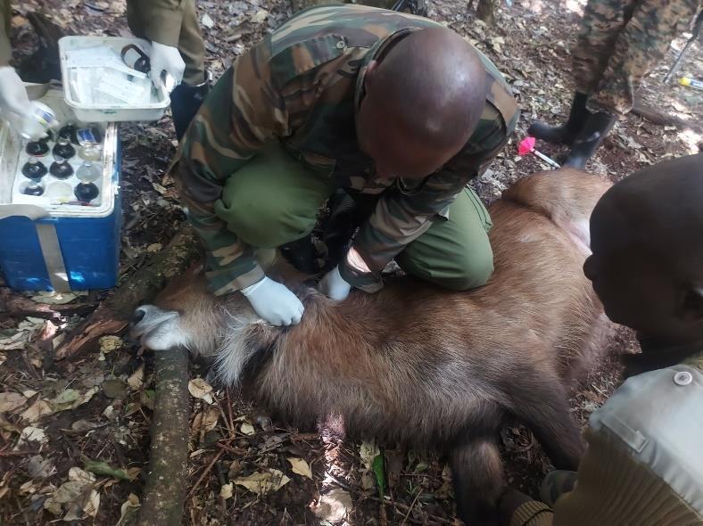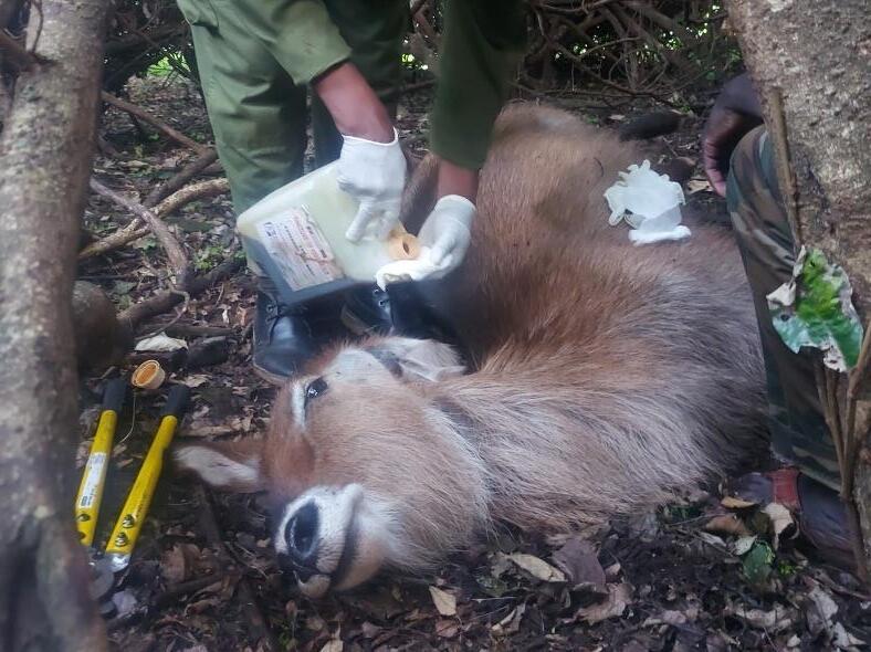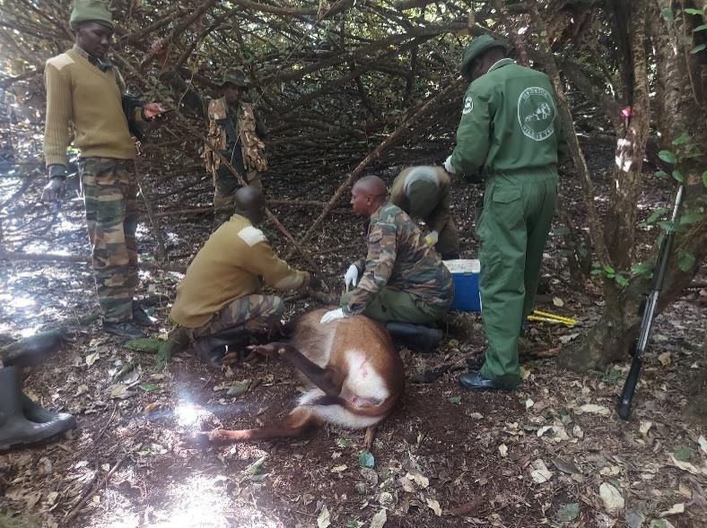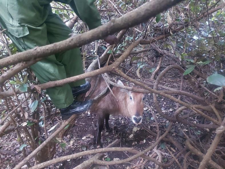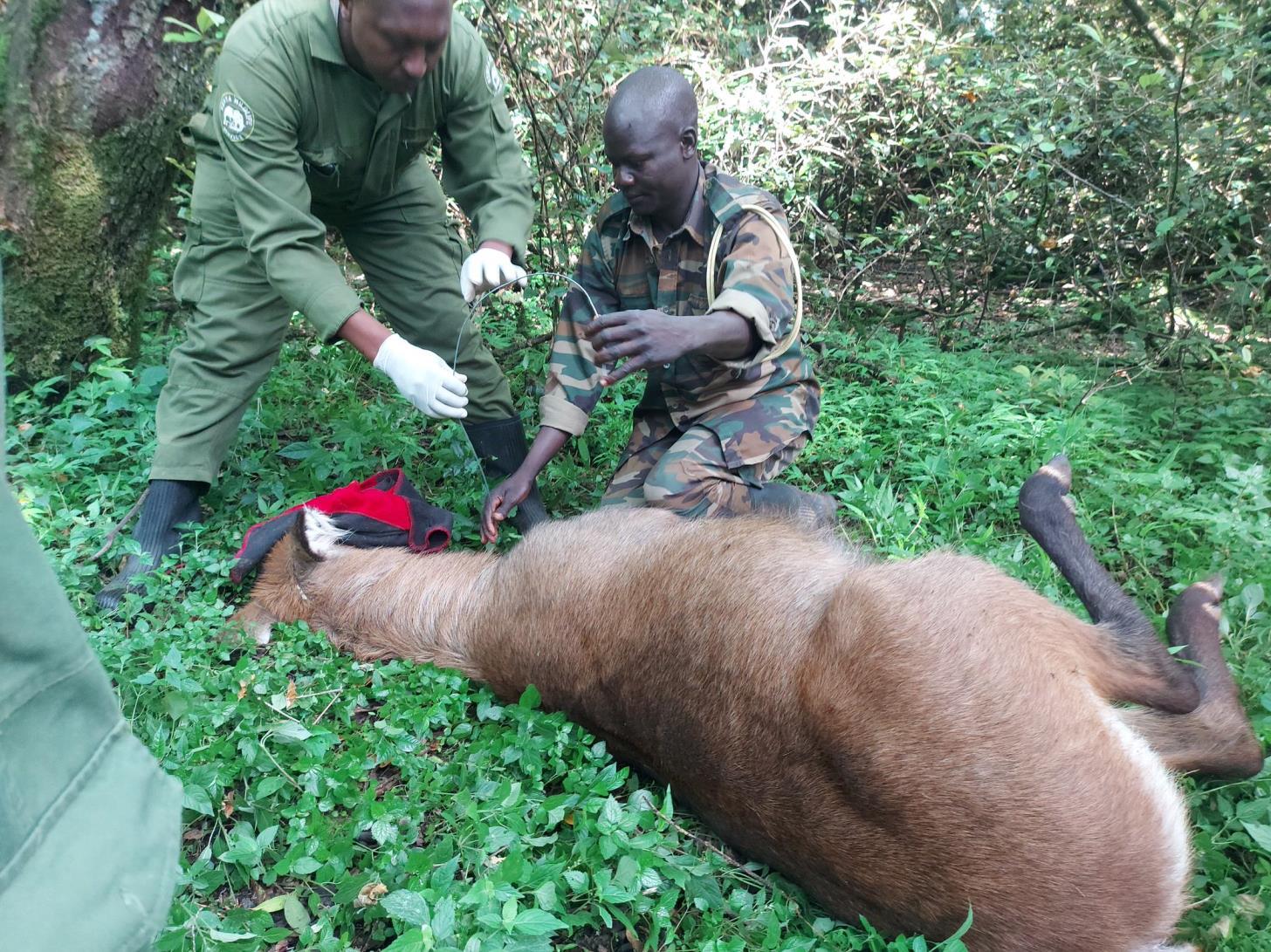 Mt. Elgon National Park management reported several snared animals in the park. This was the 3rd adult female waterbuck with a wire snare around its neck.