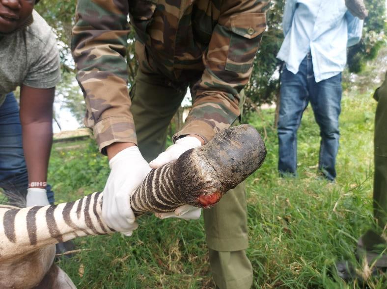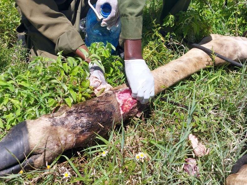 Once the snare was cut loose, the animal’s wounds were cleaned with water, rinsed with tincture of Iodine, and sprayed with a fly repellent. 9,000mg Amoxicillin, 250mg Flunixin meglumine and 40ml Catasol were administered intramuscularly while 5ml Ivermectin was injected subcutaneously. Anaesthesia was reversed thereafter with 75 mg Naltrexone given by IM and IV route.
