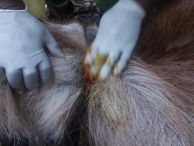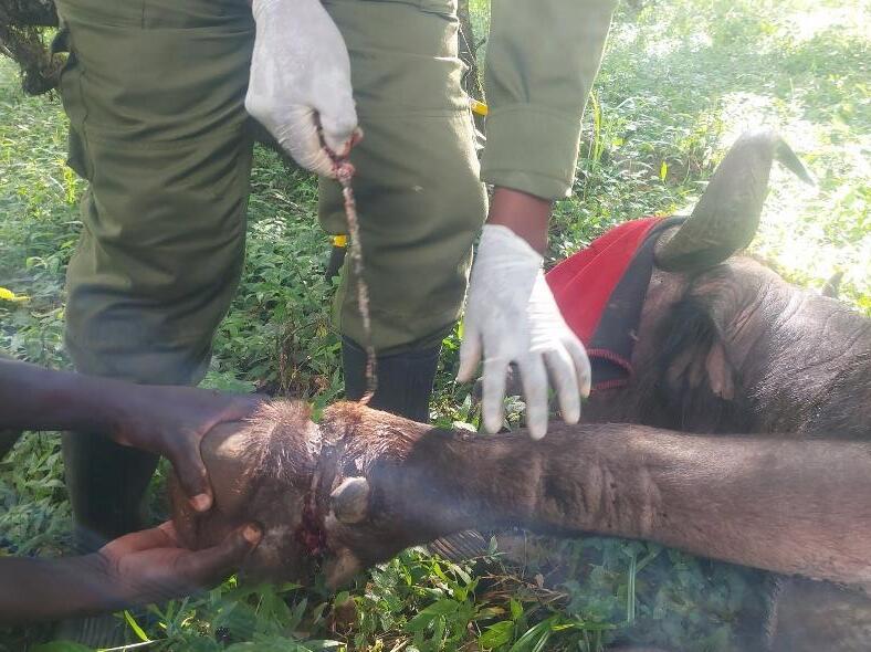 Mt. Elgon National Park management reported several snared animals in the park. This adult female buffalo had a nylon rope snare on its right front leg. The buffalo was heavily pregnant and almost near term.
