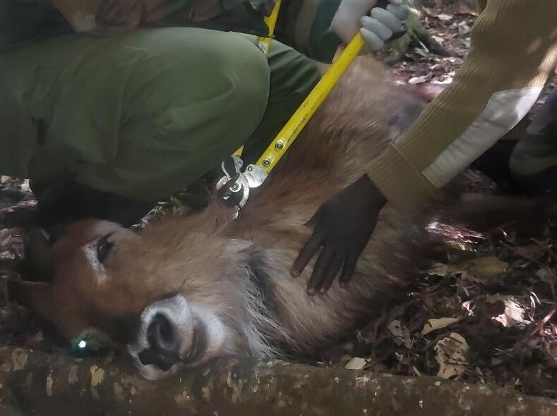 The animal had a wire snare around its neck. Fortunately, the snare had not inflicted any injuries on the animal. Once the snare was removed, anaesthesia was reversed with 75 mg Naltrexone given by IM and IV route.