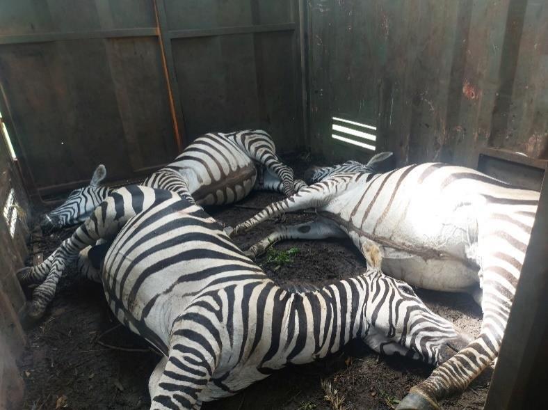 The zebras were initially loaded in the first collection chamber/ compartment of the translocation container where anaesthesia was reversed with 75mg Naltrexone. After they were fully awake and standing in the truck, the zebras were moved to the holding compartment. On 22nd May 2024, 10 zebras were translocated by a truck from Naivasha Police Station and Naivasha Prisons to Solai Wildlife Sanctuary approximately 120Km away. On 24th May 2024, 4 zebras were captured by chemical immobilization at Naivasha Prison(s). All animals were safely released in Solai Wildlife Sanctuary.