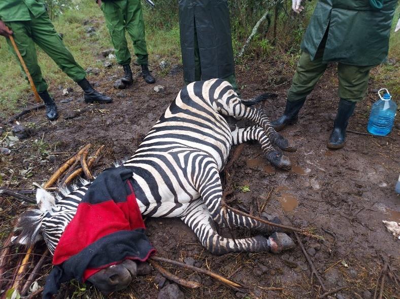 The animal was darted with 5mg Etorphine and 80mg Azaperone. The zebra had a rope on its right front leg that was tethering it to the ground
