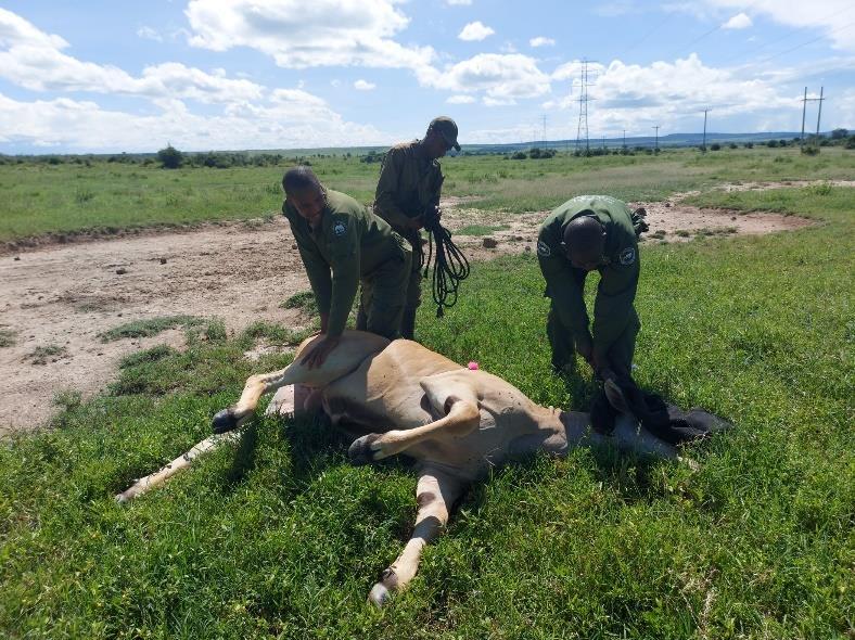 The five elands (1 male and 4 females) were captured on 23rd May 2024. Elands are usually very jittery necessitating the use of chase and dart method from a vehicle. Each adult eland was darted with a combination of 15mg Etorphine Hcl and 80mg Azaperone. The average induction time was about 9 to 10 minutes. The animals were blind folded and doused liberally with cold water to avoid hyperthermia and shock. When the animals were loaded into the translocation container, the anaesthesia was reversed with 200mg Naltrexone administered intravenously and an additional dose intramuscularly to avoid renarcotization. Recovery from anaesthesia was smooth and with no complications.
