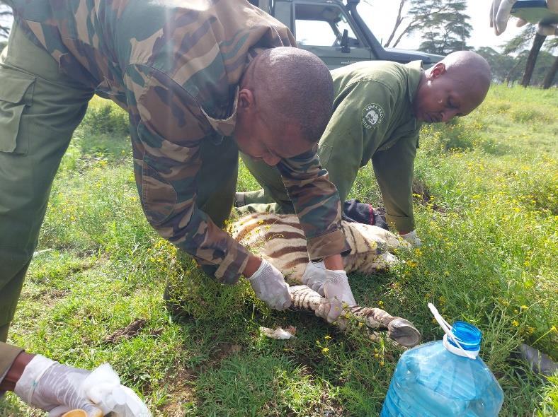 Heavy rain fell across the Central Rift Conservation Area and the Lake Naivasha Area in May 2024. The SWT/KWS Rift Valley Mobile Veterinary Unit attended to 12 Cases. 7 of these cases involved snared animals. These included 2 animals (1 Masai giraffe and 1 zebra) in the Lake Naivasha Area and 5 animals (4 waterbucks and 1 buffalo) in Mt. Elgon National Park. Sadly, the snared buffalo died during treatment, and even more tragically, it was heavily pregnant and near term.