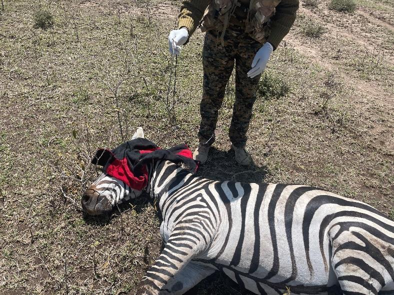 The zebra was darted with 5mg Etorphine and 60 mg Ketamine. It had a snare around the neck with no injury. The snare was removed then anaesthesia was reversed with 75 mg Naltrexone given by IV & IM route. The Zebra has a good prognosis.