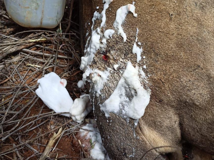 The wound was debrided with Hydrogen peroxide, flushed with Iodine and covered with Oxytetracycline spray. Additionally, 1000 mgs Amoxicillin was administered intramuscularly.