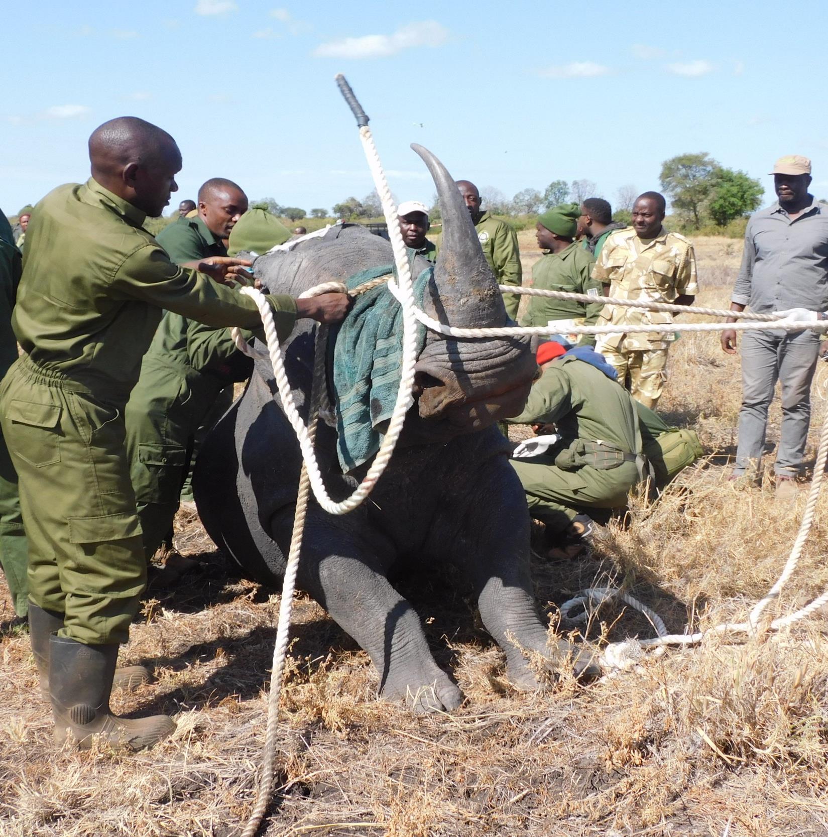 The rhino was approached on foot and darted with 4mgs Etorphine and 80mgs Azaperone on the right rump. The drug took effect after 6 minutes, and the animal went down on right lateral recumbency. Treatment and anaesthesia monitoring was done simultaneously. It was observed that the rhino had a rectal prolapse and a spinal cord injury believed to have been suffered during a territorial fight. The spinal cord injury resulted in paralysis of the hind legs hence the sitting posture.