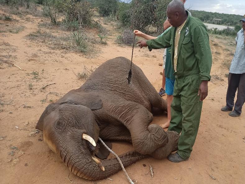 Rangers in the area reported seeing a lone elephant roaming about with a spear lodged into the left side of its abdomen. Upon arrival, the Mt Kenya Mobile Veterinary Unit found the elephant stuck in the middle of a dam.