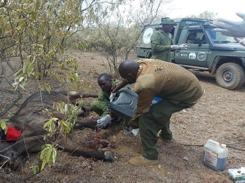 The Rift Valley Vet Unit was called to attend to a rhino calf that had suffered severe injury, but on arrival it was established that the calf had passed on 5 6 hours earlier and rigor mortis had set it.