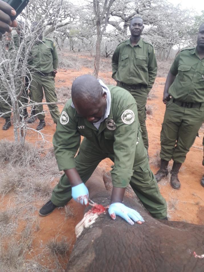 The carcass was about 2 days old and had begun to decompose. A chunk of flesh had been carved out along the elephant’s left spine, and the only tusk had been hacked off. Fresh vegetation had been placed on the carcass to conceal it.