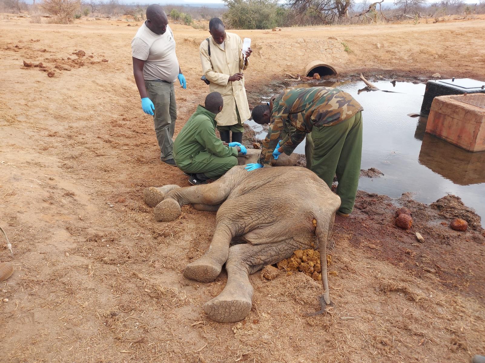 The sisal ranch management informed the Veterinary Unit that this elephant calf had collapsed and attempted to rise severally without success. This happened when the calf and her family went to drink water at the ranch.