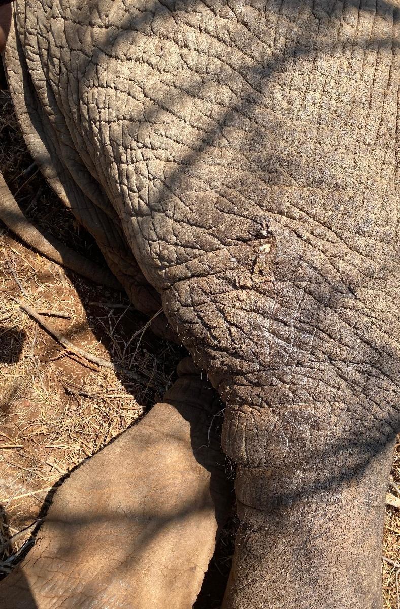 A male elephant was found lame and reported to AMVU. The vet team travelled to the site using a Land Cruiser pickup, and helped in assessment, immobilisation, examination and treatment of the bull.