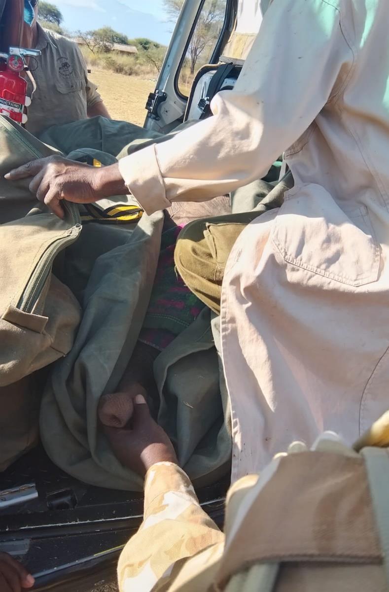 The calf was manually restrained by a team of 3 rangers and transported in a Land Cruiser to Kimana Sanctuary Airstrip for aircraft delivery to Nairobi.