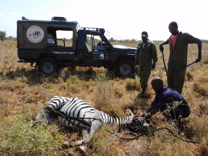 The anaesthetic was reversed, and the zebra stood within two minutes and joined its herd. Prognosis is good.