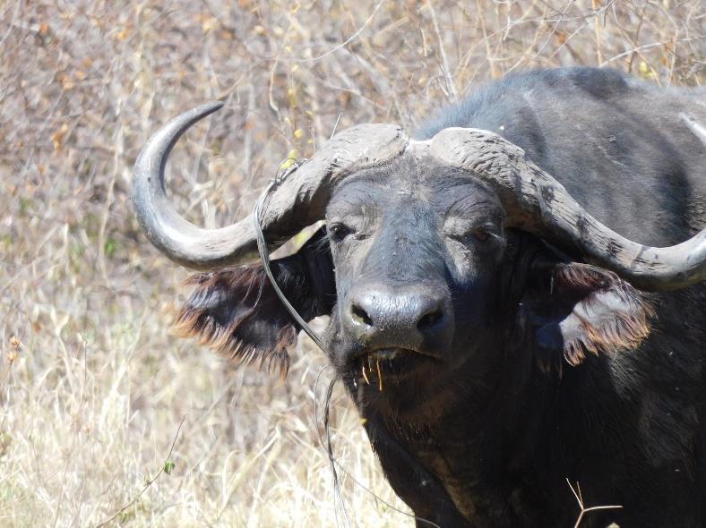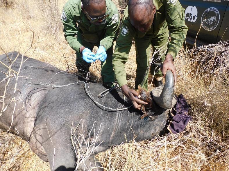 The male African buffalo was found in the company of two other bulls within a dense thicket along the Mulika River, wallowing in mud to thermoregulate and seeking shade from the intense afternoon sun. The buffalo had a wire snare tightly constricting its right horn and neck. To facilitate a safe intervention, the herd was carefully herded to an open area using a vehicle. The snared bull was then chemically immobilized following a brief pursuit, by darting on the rump with a combination of 7mgs of Etorphine and 80mgs Azaperone. The drugs took effect within five minutes, and the animal assumed sternal recumbency.