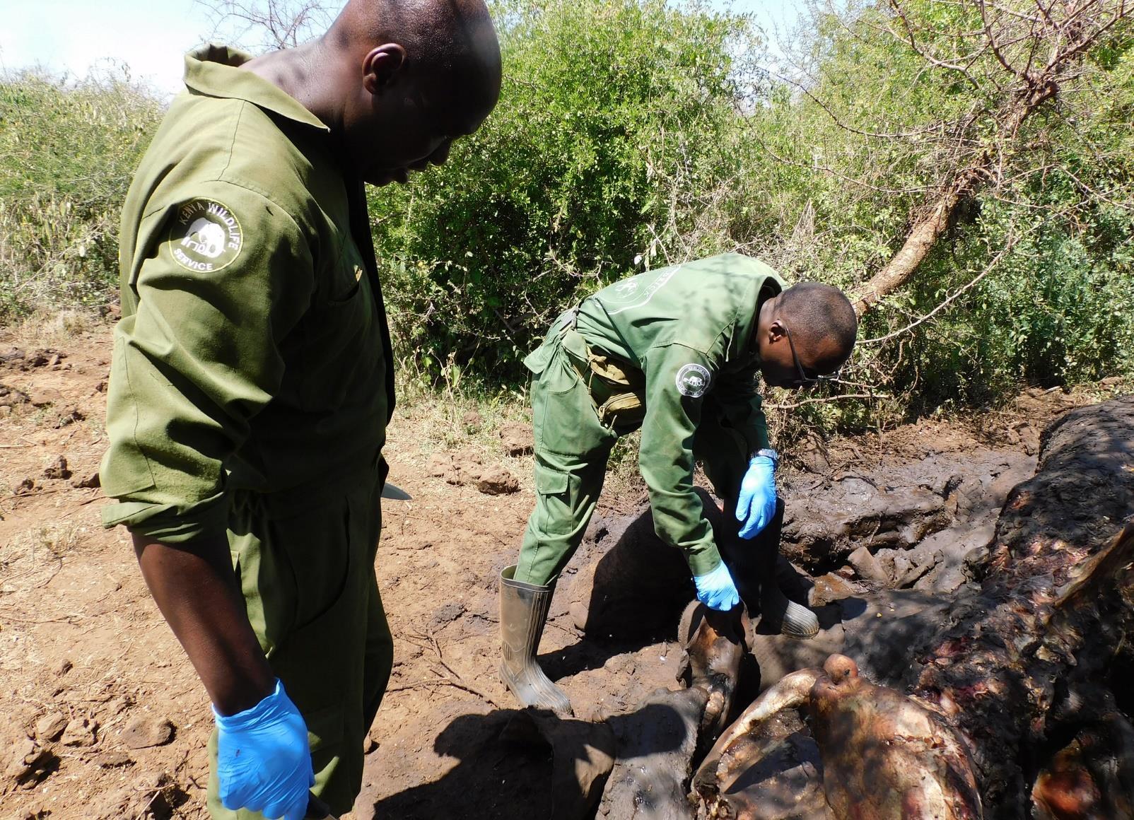 The carcass was discovered in a sternal position, with the tusks already retrieved by the KWS. The surrounding area had substantial disturbance suggesting evidence of a struggle preceding death. Despite scavenging, the elephant demonstrated adequate fat and muscle coverage along the spinal column, indicating a fair body condition. A large wound, approximately 4 inches in length, was observed near the temporal bone adjacent to the ears. This wound, suspected to have resulted from a gunshot, showed no correlation with internal organ damage. There were no significant injuries to the cranial bones or soft tissues, which were also free of significant haemorrhage or congestion, suggesting the absence of major trauma. The carcass had been extensively scavenged, resulting in the loss of multiple organs and significant portions of the muscle tissue, thereby hindering the ability to conduct a comprehensive and conclusive necropsy.