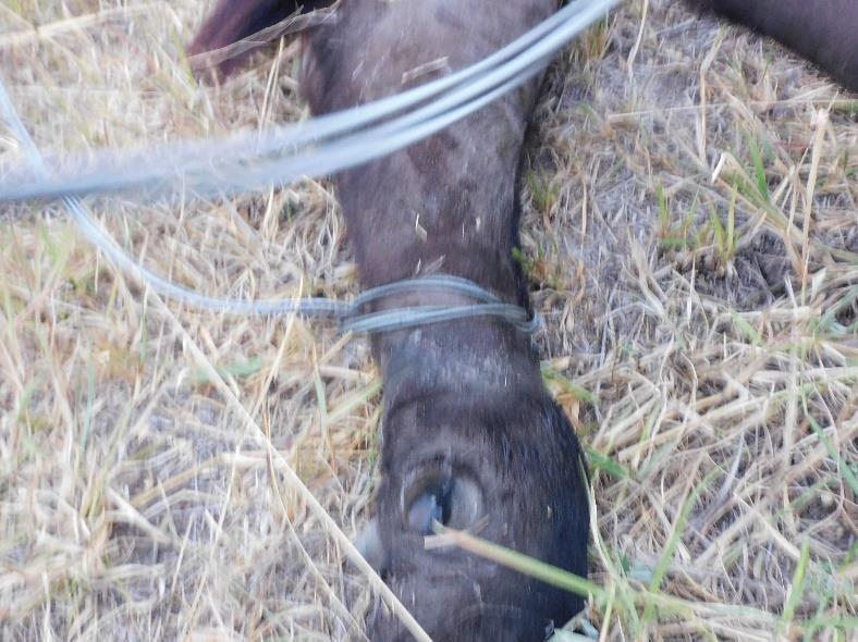 On examination, the snare was noted to have since fallen off leaving soft tissue injuries that were causing lameness. The wounds were cleaned with water, debrided with Hydrogen peroxide and flushed with Iodine. Intramuscularly he received antibiotics and anti-inflammatories.